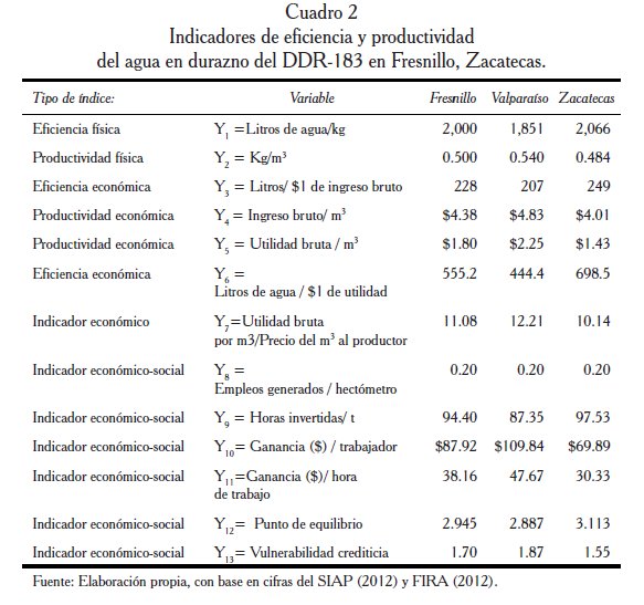 En el cuadro 2, se muestran los indicadores de eficiencia y productividad física, económica y social del agua de riego en el cultivo de durazno en Zacatecas.