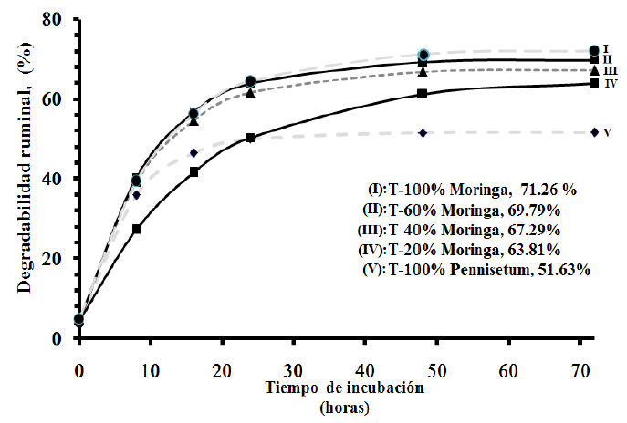 Por su parte, la degradabilidad efectiva tuvo una tendencia similar en los ensilados de moringa, con valores que oscilaron desde 83.30, 80.45, 78.34 y 78.87%, según niveles de inclusión (20, 40, 60, 100%) de la arbórea, respectivamente (cuadro 3). También se encontró que durante la dinámica de degradación ruminal de la MS pasadas las 48 horas de incubación, los ensilados con participación de moringa presentaron una tendencia a la estabilización, y donde el 60% de moringa en la mezcla mixta, a las 72 h, alcanza el valor más elevado de degradación de la MS (69.79%), sólo superado por el 100% de moringa (71.21%) (figura 1).