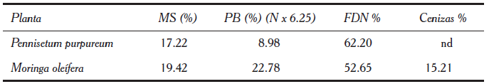 MS= Materia seca; PB= Proteína bruta; FB= Fibra en detergente neutra; nd= no se determinó.