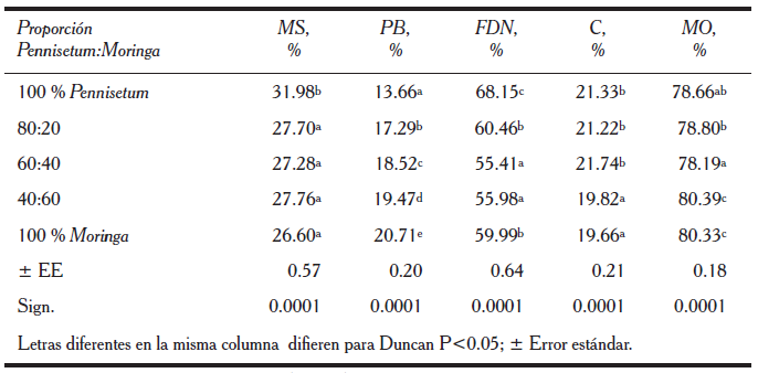 La composición química de los ensilajes mixtos (Pennisetum:Moringa), con respecto al control (100% P. purpureum) mostró valores bajos y diferentes estadísticamente (P<0.0001) en lo que respecta a la concentración de la MS; así como un crecimiento significativo (P<0.0001) en el contenido de proteína conforme se incrementó la proporción de moringa en la mezcla, aunque dentro de las mezclas mixtas el 60% de inclusión de moringa alcanzó el valor más alto, similar comportamiento ocurrió con la materia orgánica; mientras que la FDN y ceniza disminuyeron (cuadro 2).