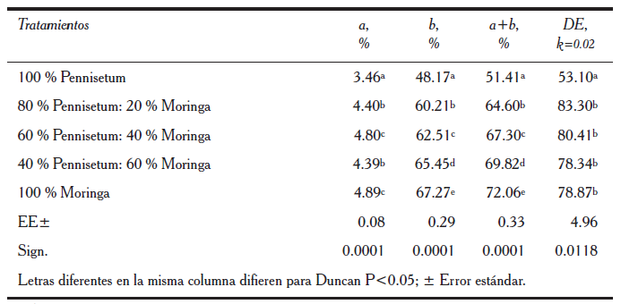 Las características de la cinética de degradación ruminal de la MS, en este estudio, mostró valores bajos para la fracción (a), la que pudiera atribuirse (aunque no determinadas), por las diferencias en el contenido de carbohidratos solubles o no estructurales de las mezcla (Pulido y Leaver, 2000); sin embargo, es necesario destacar que los valores máximos de degradación potencial en los ensilajes con participación de moringa, resultan similares a los valores reportados por Gutiérrez et al. (2013), de 65.10% con la planta sola, y edad similar a la de este estudio (60 días); lo que afirma que esta especie posee una pared celular que se degradan rápidamente, que puede ser utilizada por los microorganismos ruminales durante la digestión como fuente proteica y energética, y que los factores anti-nutricionales de la moringa no deben ser considerados de importancia como para afectar su digestibilidad (Reyes, 2004).