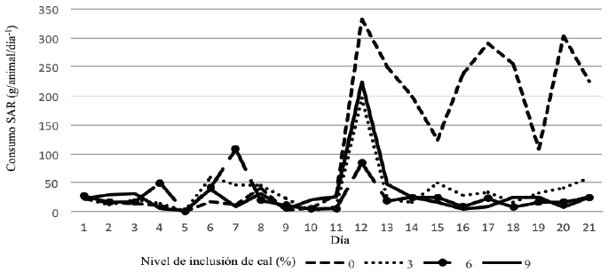 La dinámica de consumo de los diferentes SAR, se asocia con el proceso de eufagia en el inicio de la prueba, donde la exploración de nuevos alimentos provoca que éstos no se consuman o que su ingestión sea baja (Frutos et al., 2001). Sin embargo, en la medida que pasó el tiempo, aquellos tratamientos que incluyeron la cal, mantuvieron bajos consumos.