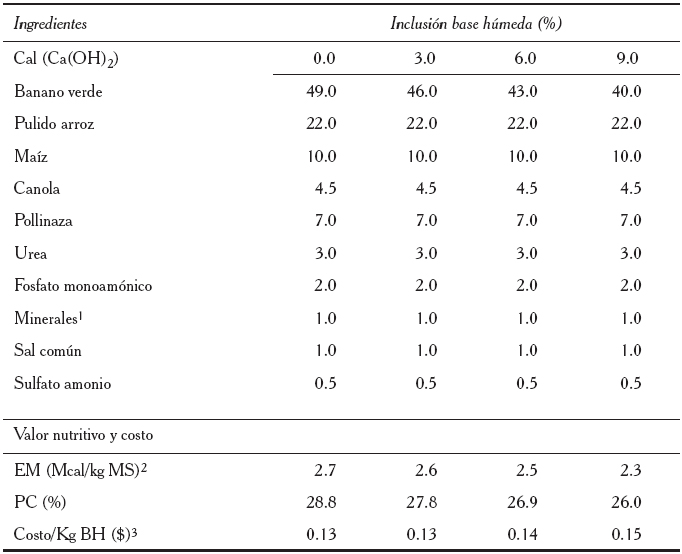 Por otro lado, en la elaboración de este tipo de suplementos se utiliza la melaza como fuente de carbohidratos de fácil fermentación; pero debido a fluctuaciones en su disponibilidad y precio, se hace necesario incorporar otras fuentes energéticas. Este es el caso del banano verde de rechazo, producto del descarte de los empaques: posee un alto contenido de almidón (Pineda-Gómez et al., 2014). Sin embargo, se desconoce qué cantidad de cal se necesita, para restringir el consumo voluntario combinado con banano verde en la elaboración del SAR.
