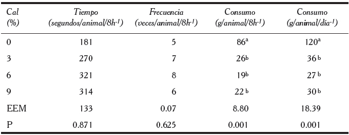Se demostró que no es necesaria la compactación —como sucede con los bloques multinutricionales (BMN)— donde la dureza es uno de los principales factores que limita el consumo por los animales (Mejías et al., 2007). En el caso del BMN, Osuna et al. (1999), registraron valores de consumo de 0.016 hasta 0.066 kg/100 kg de PV/día, con niveles de 7.5 a 10% de cal. Este resultado fue semejante a lo logrado en el presente ensayo, con 0.019 kg/100 kg de PV/día con la adición de la cal y de 0.084 g/100 kg de PV/día, sin su inclusión.