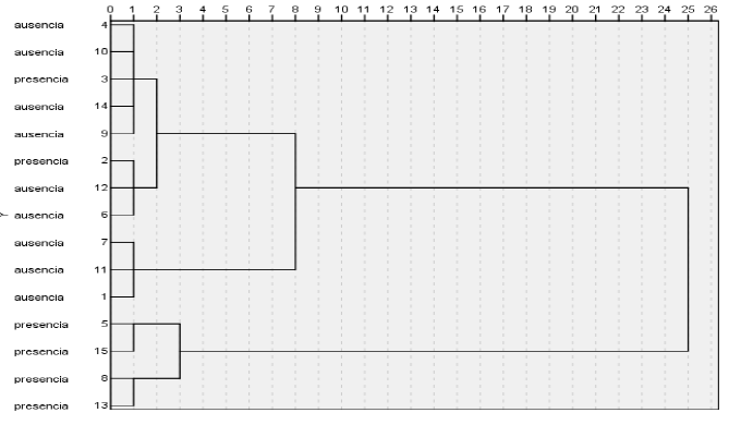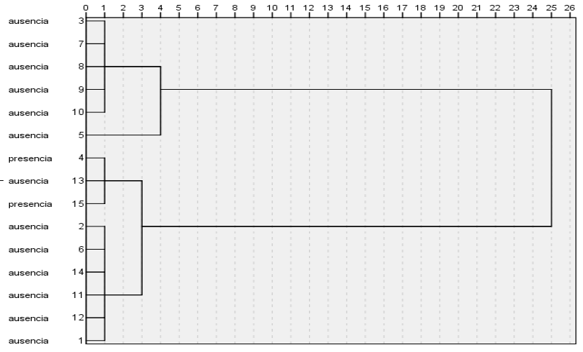 En la figura 2, de manera semejante, el análisis del cluster efectuado a las muestras de leche cruda tomadas en las tiendas, se conformaron por tres clusters; donde el primer agrupamiento se dio por la muestra 5, el cual es el más bajo de todos los conglomerados, ya que presenta una media de 9.000 x 104 UFC/ml (aerobios mesófilos), <1.0 x 101 UFC/ml (coliformes totales) y 4.500 x 103 UFC/ml (Staphylococcus aureus); seguido del segundo conglomerado, formado por las muestras 3, 7, 8, 9 y 10, las cuales fueron las menos contaminadas, con una media de 8.300 x 105 UFC/ml (aerobios mesófilos), 2.000 x 102 UFC/ml (coliformes totales) y 1.200 x 102 UFC/ml (Staphylococcus aureus); y el tercer conglomerado, formado por las muestras 4, 13, 15, 2, 6, 14, 11, 12 y 1, que resultaron ser altamente contaminadas, con una media de 1.622 x 106 UFC/ml (aerobios mesófilos), 3.978 x 104 UFC/ml (coliformes totales) y 3.878 x 103 UFC/ml (Staphylococcus aureus).