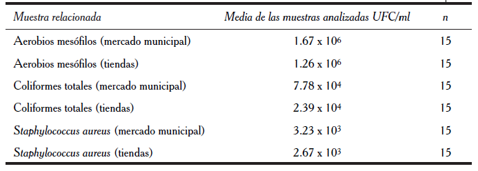El cuadro 1 muestra las medias de los microorganismos analizados, encontrándose recuentos de aerobios mesófilos 1.67 x 106 UFC/ml en el mercado municipal y 1.26 x 106 UFC/ml en las tiendas; recuentos de coliformes totales 7.78 x 104 UFC/ml (mercado municipal), 2.39 x 104 UFC/ml (tiendas); finalmente, en recuentos de S. aureus 3.23 x 103 UFC/ml (mercado municipal) y 2.67 x 103 UFC/ml (tiendas).