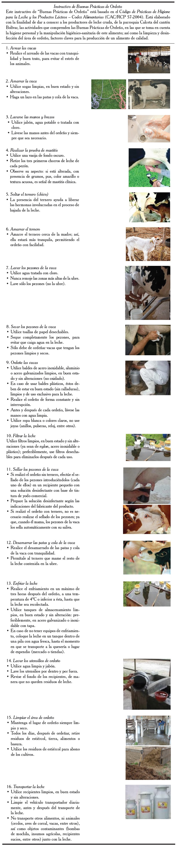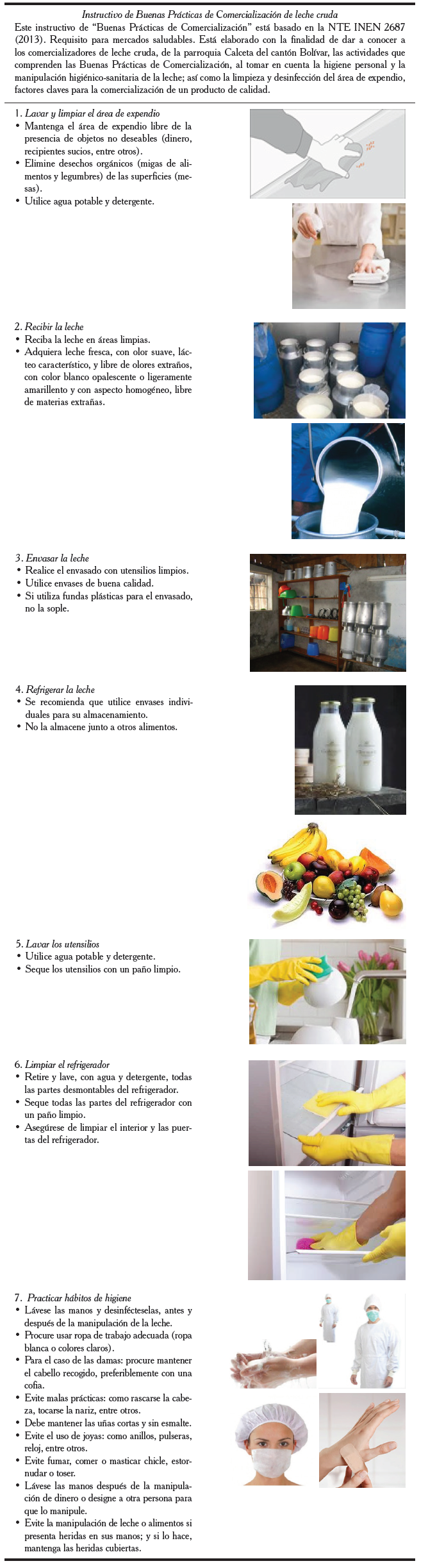Se elaboraron dos instructivos: el primero, “Buenas prácticas de ordeño”, que se basó en el Codex Alimentarius (2004); y el segundo, “Buenas prácticas de comercialización”, basado en la NTE INEN 2687 (2013); los cuales, posteriormente, fueron entregados a los productores y comercializadores de leche cruda.