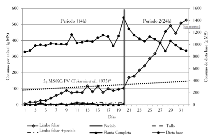 A su vez, estos resultados difieren de lo señalado por Tokarnia et al. (1975), quienes mencionaron que el consumo de R. communis provocó intoxicación e, incluso, la muerte de bovinos a una dosis de 5 g MS/kg PV. Diferente a lo observado en el presente ensayo, en donde después de 20 días de consumo de manera gradual, los animales superaron esta dosis tóxica; que, inclusive, llegó a ser hasta tres veces superior a lo indicado por estos autores, fenómeno que puede explicarse como un mecanismo de adaptación al principio tóxico contenido en las hojas (alcaloide ricinina), como lo mencionaron Silva et al. (2006).