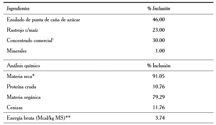 Se realizó una prueba en jaulas metabólicas individuales dividida en dos periodos; en ambos casos, se ofertó una dieta de mantenimiento dos veces al día: 08:00 y 16:00 horas (cuadro 1); la primera fue una prueba de cafetería durante 20 días, sin adaptación a los tratamientos, pero con adaptación a las jaulas y a la dieta base ofertada por siete días, con agua a libre acceso; posterior a la adaptación se ofertaron las distintas partes morfológicas de la planta de R. communis (Rc) en forma de harina. Los tratamientos consistieron en harina de: limbo foliar (lámina de la hoja; HRc), peciolo (PRc), tallo (TRc), limbo foliar + peciolo (HPRc), planta completa (PCRc) y un segundo periodo fue desarrollado durante 12 días con disponibilidad de 24 horas de la harina del limbo foliar de R. communis separada de la dieta base.