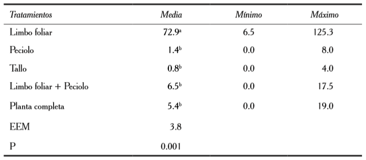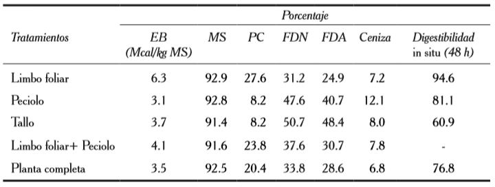 Con relación al contenido nutrimental (cuadro 2), se observó que el limbo foliar presentó el mayor valor energético de 6.3 Mcal/kg MS en EB, y de proteína cruda con 27.60 %, así como el menor contenido de FDN y FDA; además, se observó que obtuvo el mayor porcentaje de degradabilidad ruminal in situ (94.6 % a las 48 h) comparada con el resto de los tratamientos.