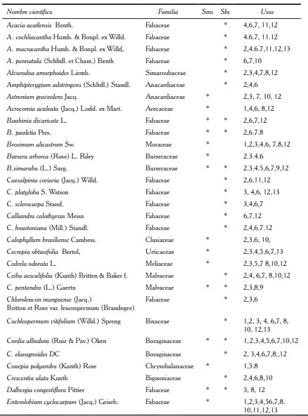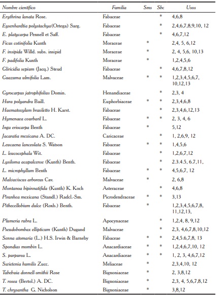 En estudios realizados por Román et al. (2011) y Román y Mora (2013), se resalta la importancia de especies maderables en sistemas silvopastoriles y remanentes del bosque tropical caducifolio y subcaducifolio, con ganadería extensiva, en el municipio de Tomatlán, Jalisco; las especies que aportan el mayor volumen maderable para aserrío son: H. polyandra, E. cyclocapum, T. rosea, T. donnell smithii y C. elaeagnoides. Otras especies presentes pero no abundantes son: S. humilis y C. odorata, consideradas de mayor valor en el mercado.