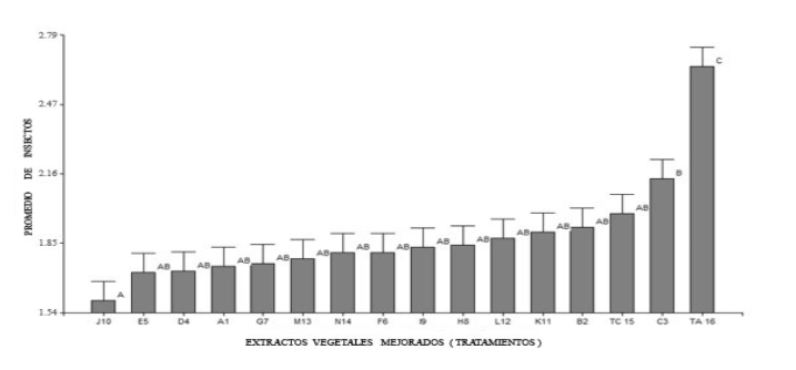 Se destaca, en cuanto a presentar el menor número de insectos vivos, el tratamiento J10 a base de Jaboncillo, E5 que corresponde a la mezcla de ajo + neem y D4 mezcla de ají + ajo, respectivamente (figura 1).