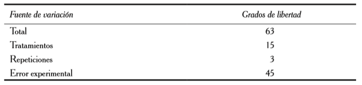 En el delineamiento experimental se utilizó un diseño de bloques completos al azar (DBCA), unifactorial, de 16 tratamientos incluidos dos testigos, en cuatro repeticiones; y para comparación de promedios en tratamientos, la prueba de significación Tukey, al 5% de probabilidad.