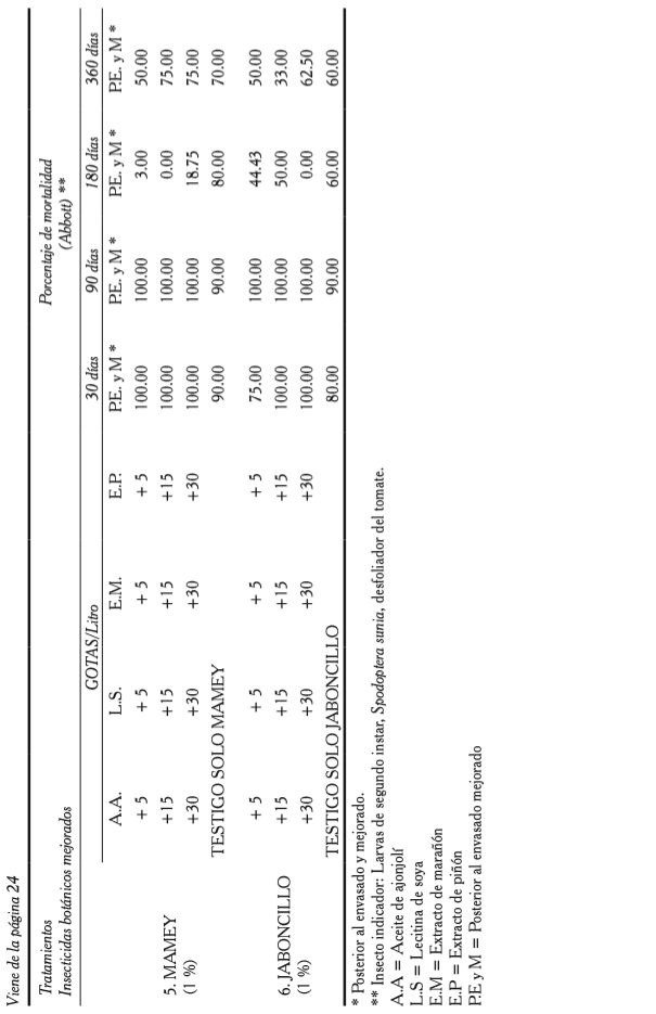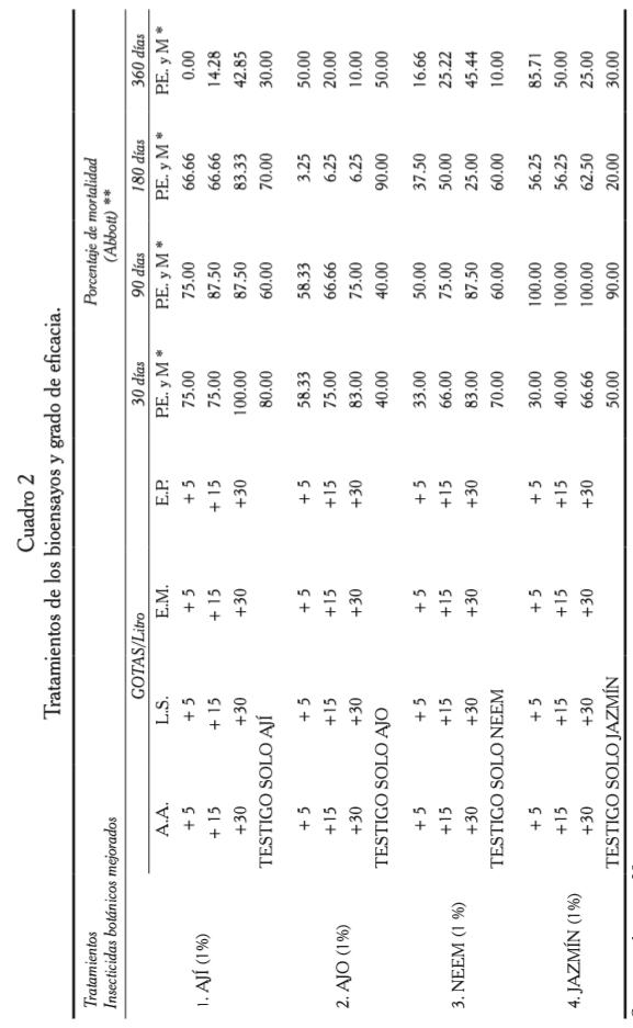 De los resultados de los bioensayos que se realizaron durante un año-calendario y con frecuencia trimestral, se infieren —como tratamientos promisorios— los extractos de: jaboncillo, mamey y jazmín en orden de importancia y la dosis del 1% podría incrementarse, según los estadíos larvales más avanzados, así como el incremento poblacional de insectosplagas y tipos de cultivos a nivel de campo. Asimismo, es determinante el mejoramiento de las propiedades insecticidas, si se compara con el porcentaje de mortalidad obtenido en los tratamientos testigos, sin aditamento alguno, que reportan menos eficacia (cuadro 2).
