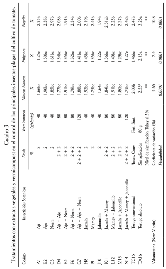 Los resultados de los bioensayos fueron trasladados al campo en cultivo de tomate, con los extractos solos y en mezclas en dosis del 2%, y complementados con aplicaciones de humus en tipo vermicompost (Eisenia foetida); específicamente, para el control de insectos-plagas: mosca blanca (Bemisia spp.), pulgones (Aphis spp.) y negrita (Prodiplosis longifila), aplicando riegos iniciales con regadera, con el fin de reducir adultos de los insectos por efecto del control mecánico por ser muy sensibles; y, al parecer, retardaron fumigaciones convencionales hasta 50 días del trasplante, en verano (cuadro 3).
