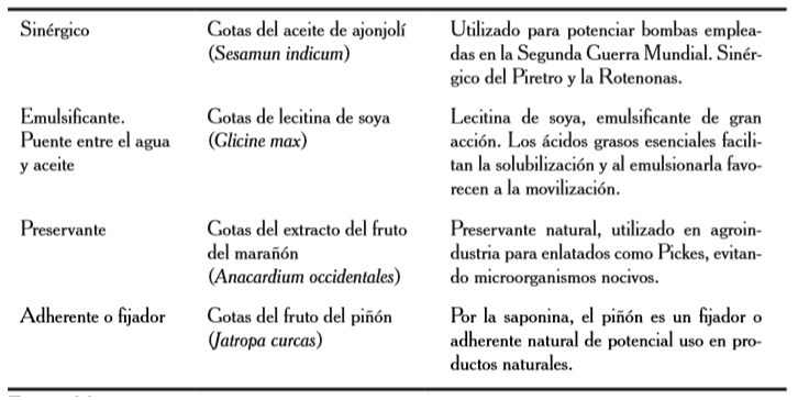 Como adherente, se puede utilizar el jugo de sábila (Aloe vera) y piñón (Jatropa curcas); mientras que como tensoactivos, el henequén (Agave fourcroydes) y el jaboncillo (Sapindus saponaria) (cuadro 4).