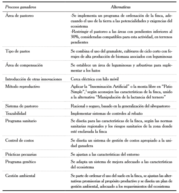 La información procesada fue analizada por un panel de expertos, que definió las alternativas para la implementación de producciones sostenibles, en los sistemas tipificados —a través de técnicas que permitieron predecir el comportamiento de la actividad productiva— con la implementación de las alternativas identificadas, las que se validaron en las mejores fincas ganaderas de cría y leche en sistemas de doble propósito, del área de estudio.