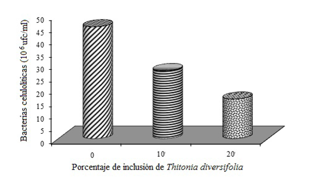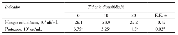 El efecto de un suplemento con tithonia produjo 43 x 10 6ufc/ml bacterias celulolíticas; mientras que en el control, la población de este grupo fue 39 x 10 6ufc/ml. Las bacterias amilolíticas y hongos celulolíticos no se modificaron por la inclusión de tithonia en el suplemento y las bacterias totales se redujeron en 27% su población, debido a la inclusión de T. diversifolia en el suplemento, se redujo a la mitad la población de protozoos del rumen, incrementó el pH y la concentración de NH3 (Informe Final de proyecto CITMA/GEPROP. Código: 0300285/2013).