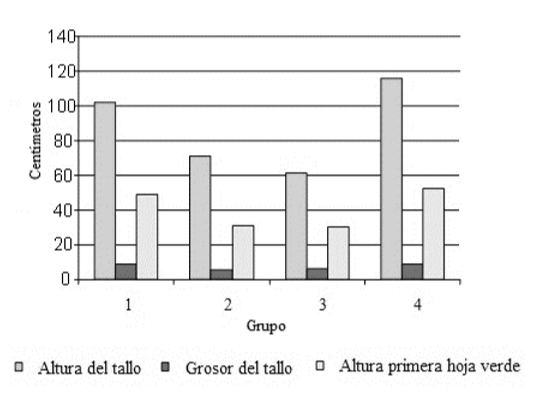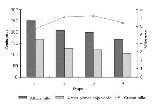 En sentido general, los Grupos 1 y 2 tuvieron un comportamiento semejante con relación a las medidas tomadas, y agrupan las plantas con un desarrollo intermedio: el Grupo 1 dispone de las plantas más altas (251 cm) de todo el material evaluado, así como también el mayor valor de la altura de la primera hoja (169 cm). El Grupo 2 posee un número más alto de hojas caídas (291) y secas (107) / planta y el mayor grosor del tallo (7.20 mm).
