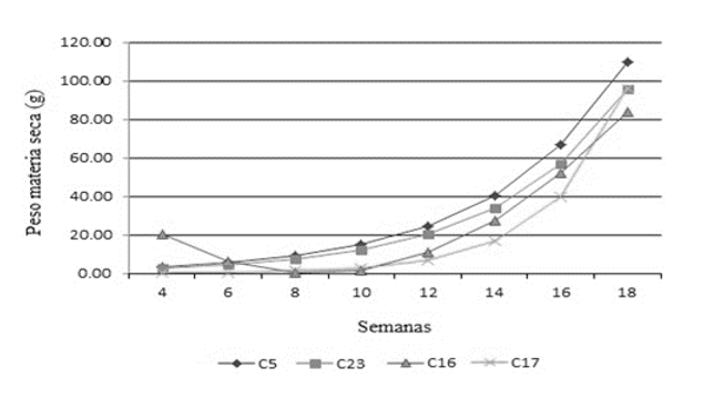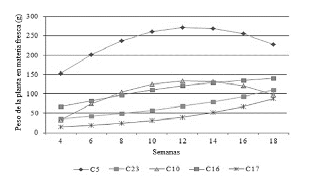 Todas las plantas tienen un crecimiento lento en las primeras semanas después del corte para todas las medidas en estudio. Los materiales que integralmente presentan indicadores altos de crecimiento son el 5 y 23. Mientras que el 10 es intermedio y el 16 y 17 bajo (figuras 3 y 4).
