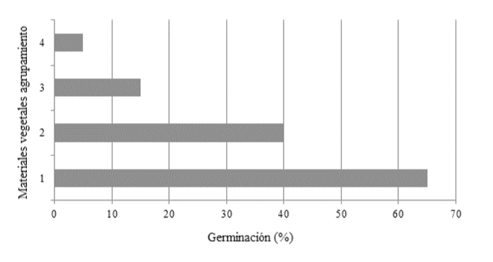 Se destaca —como un aporte al conocimiento— la capacidad de germinación que tienen la semilla gámica de los 29 materiales evaluados (Ruíz et al., 2014), que osciló desde 3 hasta 63%; y se comprobó que 12 de ellos, presentaron valores superiores al 28% (figura 5). Los materiales de mayor porcentaje fueron el 13, 17 y 25; lo que indica la posibilidad de sembrar esta planta por vía gámica.