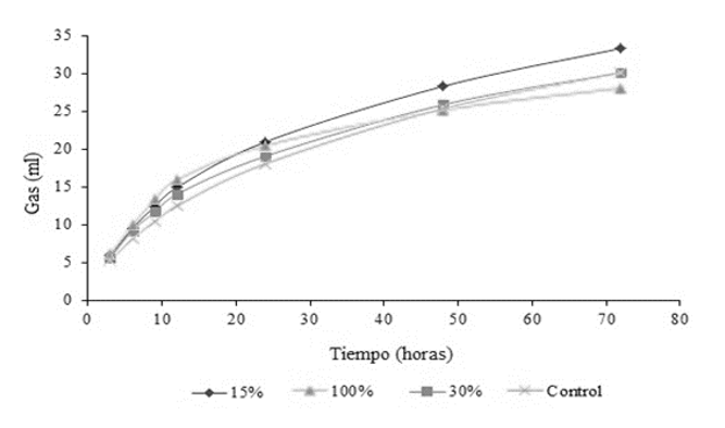 Mientras que la combinación de diferentes niveles T. diversifolia m. v. 10: P. purpureum Cuba CT- 115 (control 0, T1, 15 %, T2, 30 % y T3, 100 %) indicó que la relación 15:85 permitió una mayor capacidad fermentativa del CT-115; y la inclusión del arbusto provocó un aumento en la eficiencia y velocidad de producción de gas del CT115, lo que pudiera favorecer la disponibilidad de nutrientes para los microorganismos del rumen (La O et al., 2009). Los resultados de la fermentación (figura 6) se ajustaron al modelo exponencial Y= a+b* (1-exp-(c*t)).