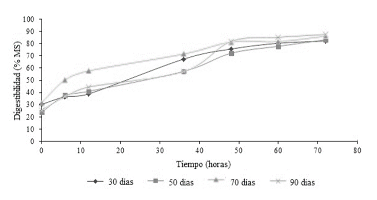 Al evaluar la edad de corte (30, 50, 70, 90 y 110 días) en la capacidad fermentativa y dinámica (figura 7) de degradación ruminal in situ de la materia seca de T. diversifolia se observó que la cinética se caracterizó por un incremento de la producción de gases con el tiempo de exposición de las muestras al ataque microbiano, con valores de 36.03, 32.12, 34.12, 37.11 y 34.7 para 30, 50, 70, 90 y 110 días de rebrote, respectivamente, con mayores valores en producción de gases a 90 h.