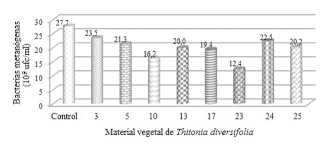 Todos los materiales vegetales evaluados de T. diversifolia redujeron la población de metanógenos ruminales y se destacaron como los más promisorios los Nos. 10 y 23. La utilización de esta planta permitió mitigar las emanaciones de metano a la atmósfera (Galindo et al., 2010), procedente de la fermentación ruminal, lo que contribuyó a reducir el efecto que este gas ejerce como efecto invernadero (Informe Final de proyecto CITMA/ GEPROP. Código: 0300285/2013).