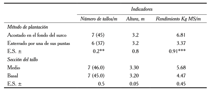 La plantación de tithonia se debe realizar acostando el tallo en el fondo del surco (cuadro 1) y utilizando indistintamente la parte basal o media con grosor de 2-3 cm, a una profundidad de 0.10 m y dosis de 3-4 t/ha de tallos (Ruíz et al., 2009a), lo que logra plantas con mejor desarrollo, más población y mayor producción de biomasa.
