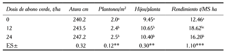 La incorporación al suelo de 12 t/ha base fresca de esta planta (Crespo et al., 2013), con seis semanas de edad, tanto en junio como en agosto, constituyó un excelente abono verde que incrementó significativamente el rendimiento del forraje sucesor Pennisetum purpureum vc Cuba CT-169 (18 t MS/ha) en un suelo Ferralítico rojo lixiviado, disminuyó la densidad aparente del suelo (0.79 g/m3) e incrementó los contenidos de MO (3.70%), N-total (0.24 %), potasio (47.6 ppm) y magnesio (0.14%). Adicionalmente, se produjo un efecto residual beneficioso del abono verde en el rendimiento de este forraje (cuadro 2).