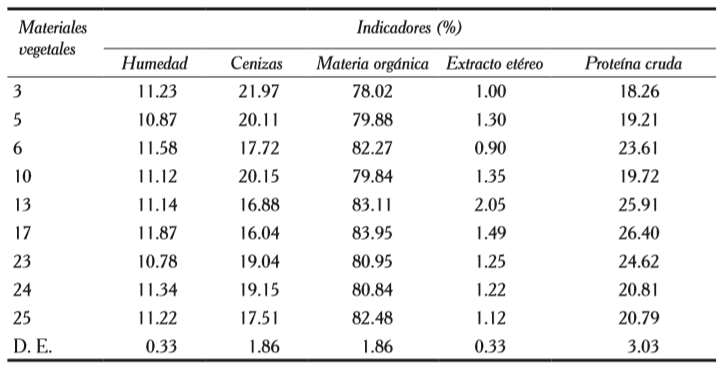 Por primera vez en Cuba se informó (cuadros 3 y 4) que la evaluación de materiales vegetales de T. diversifolia (3, 5, 6, 10, 13, 17, 23, 24 y 25) reveló valores de proteína, FND y hemicelulosa que oscilaron desde 18.26 hasta 26.40%, 32.62 hasta 41.83% y 14.79 hasta 25.74%, respectivamente; lo que denota amplia variabilidad interespecífica (La O et al., 2012). Esta planta presenta cantidades abundantes de reductores totales (+++), moderadas de taninos (++), flavonoides y alcaloides, así como bajos valores (+) de saponinas, triterpenos y antocianidinas (Scull et al., 2008).