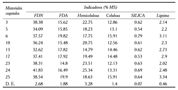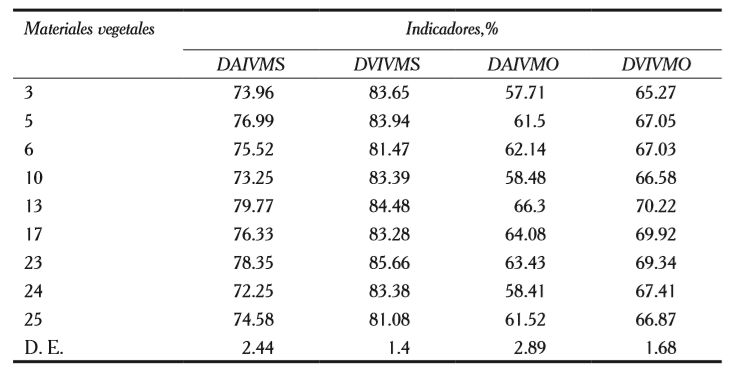 La información obtenida en la DAIVMS, MO, FND, FAD, así como en la DVIVMS, MO, FND, FDA, mediante el uso del incubador Daisy II® de diferentes materiales vegetales de T. diversifolia (3, 5, 6, 10, 13, 17, 23, 24 y 25) permitieron obtener estimados de digestibilidad aparente de MS y MO (DAIVMS y DAIVMO), con valores inferiores a las digestibilidades verdaderas de ambos constituyentes (DVIVMS y DVIVMO). Los valores de DAIVMS (cuadro 5) estuvieron en el rango de 72.25 a 79.77%, y los de DAIVMO de 57.71 a 66.20% con respecto a las cifras de DVIVMS y DVIVMO (cuadro 5), que oscilaron de 81.08 a 85.66%; y de 65.27 a 70.22%, respectivamente (La O et al., 2012).