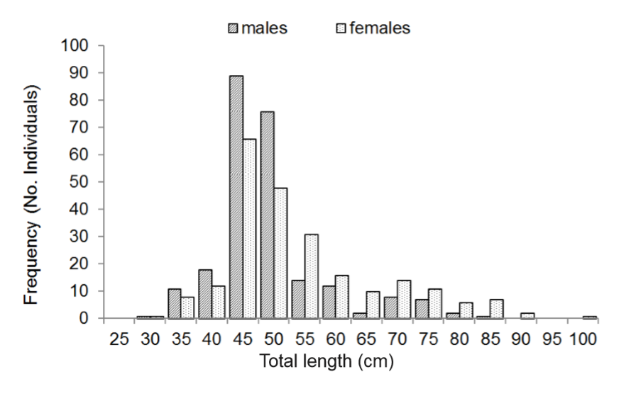 Aguirre-Villaseñor et al. (2006) reported a value of L50 = 52.10 cm, close to ours. Vega et al. (2013) obtained a value of L50 = 46.87 cm, similar to that obtained in this study. Differences in the results are related to the sample; in some places fishing has a higher pressure than in other, so the older individuals are not present any more.