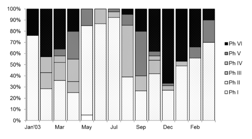 Monthly variations of the relative frequency of gonad maturity phases (figure 2) show that phase II or immature reaches its higher values from May to July, and January to March. Phase III was more abundant during August 2003 (46.34 %), showing values between 10% and 16% in the months of February to April, September to November. Phase IV, mature, the higher values are observed from February to and April. Phase V or spawning stage: spawning occurs in the months of March to May, and August to November. High values were also observed in February. Phase VI, post-spawning was observed in its highest values in January to April and a second period in September to December, but most months showed post-spawned organisms. These data assume two spawning seasons throughout the year.