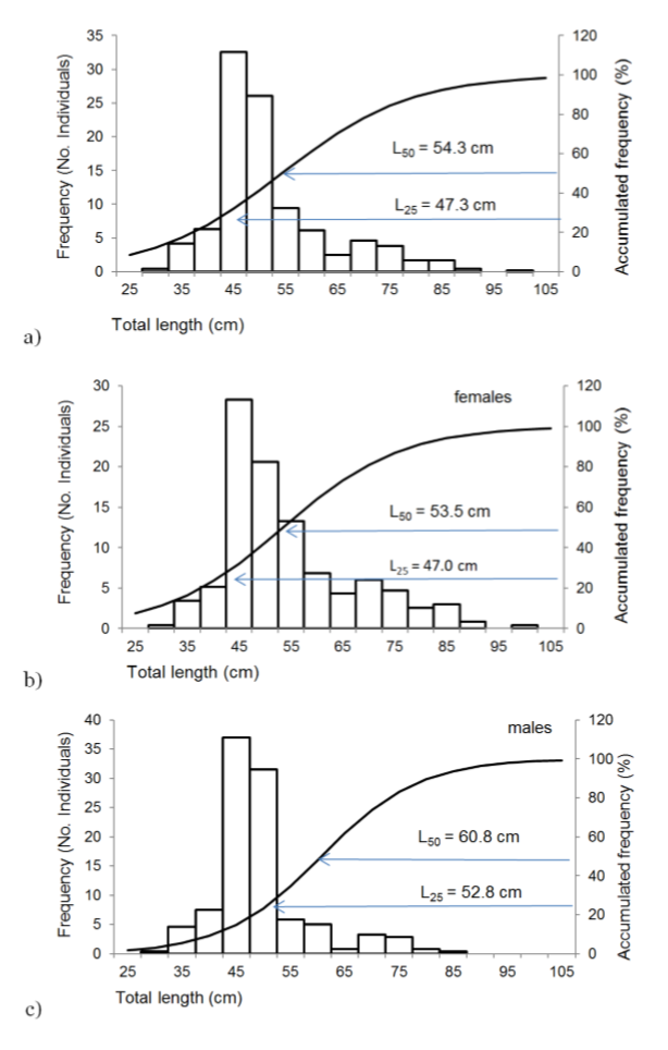 L50 = 54.30 cm for the specie (table 2, figure 3 a) corresponding to three years of age. For females, the values were: L25 = 47.0 cm and L50 = 53.5 (figure 3b), and in males L25 = 52.80 cm and L50 = 60.7 cm in males (figure 3c).