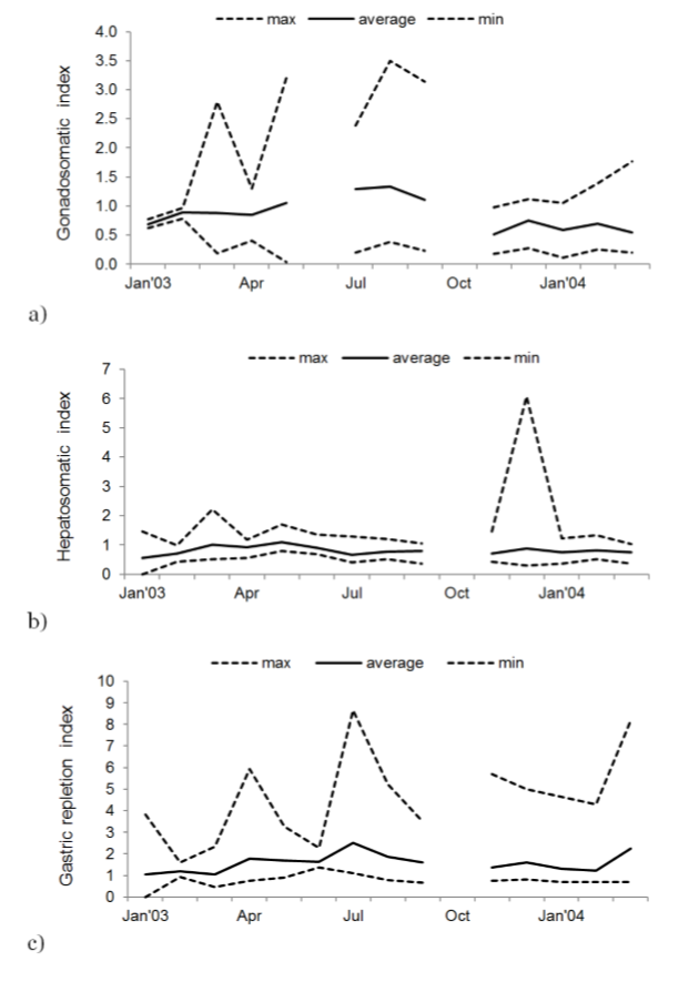 Variations in the gastric repletion index (figure 4c), showed higher values during January, March, April, July, August, November and December 2003 and March 2004; lower values are observed in February, April, September 2003 and March 2004, meaning there are changes in the food availability, therefore changes in the body indexes.