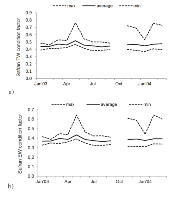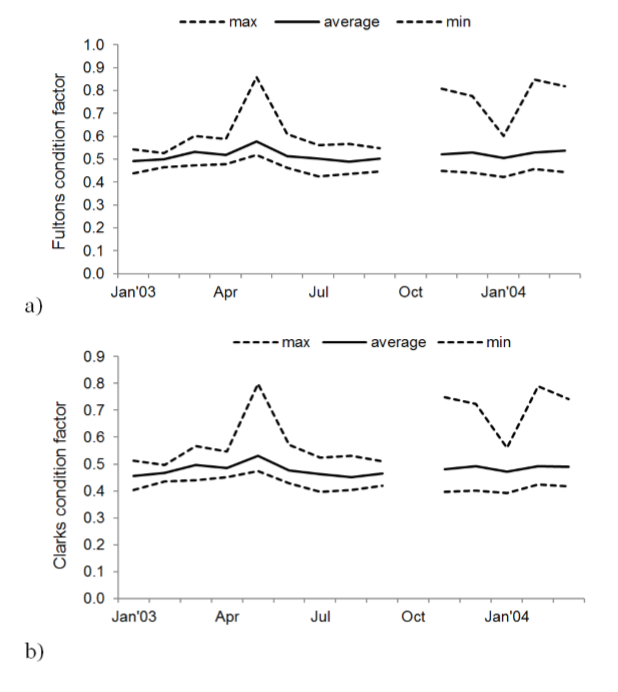 The condition factor values calculated with Fulton’s equation are higher during the months of March, May, June, November and December 2003 and January, February and March 2004 (figure 5a). The condition factor values obtained with Clark’s equation are higher during the months of May, November, December of 2003 and February and March 2004 (figure 5b).