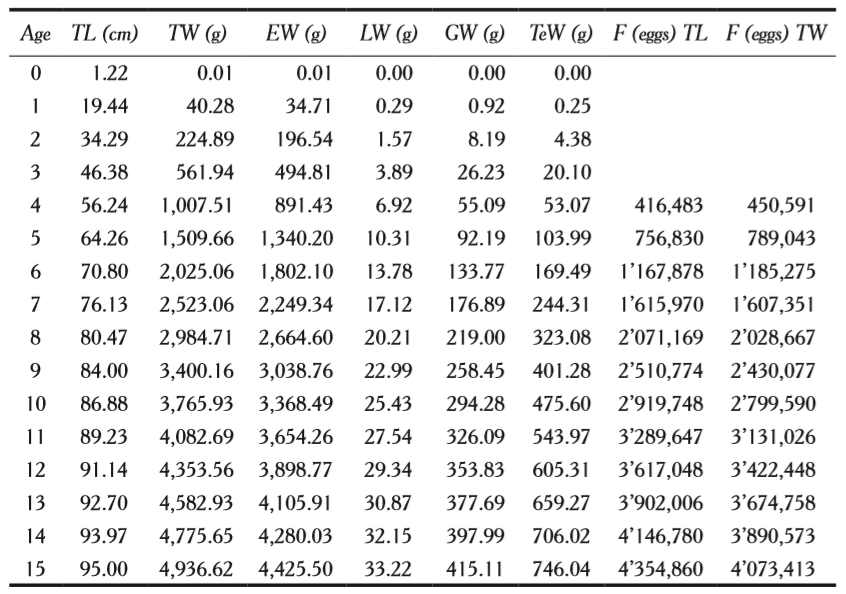 Oocyte diameter was 0.44 mm (±0.07 mm standard deviation, SD, n = 90), minimum 0.34 mm and maximum 0.59 mm. Fecundity values ranged from 416,483 to 4’354,860 oocytes (± 1’158, 956 SD, n = 42) in females of four to fifteen years of age and lengths of 56.24 cm to 95.00 cm, and 1,007.51 g to 4,936.62 g of weight (table 1). Average value of the relative fecundity was of 703.7 oocytes·g-1 (ranging from 312.6 to 1,438.4 oocytes·g-1, 320.7 SD, n = 42).