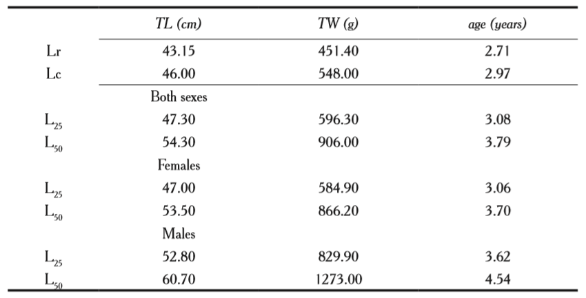Length of first maturity in Colombia was of 26.00 cm and the first reproduction of 32.00 cm reported by Collette and Nauen (1983), which are inferior to those found in this study (table 3). Similar values as our findings were published by Lucano-Ramírez et al. (2011), with a length of first reproduction L50 = 56.40 cm for males and L50 =59.30 cm for females (in our analysis males were L50 = 60.70 cm, and females L50 = 53.50 cm).