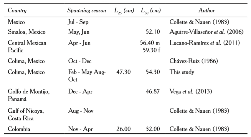 Similarly, data reported for Mexico by these authors are comparable with those found in this analysis for the months of August and September (Collette and Nauen, 1983). Likewise, in the Central Mexican Pacific, our results are similar to those reported by Lucano-Ramírez et al. (2011) in the months of April and May. In the State of Sinaloa this coincides with the month of May (Aguirre-Villaseñor et al., 2006).Vega et al. (2013) reported in the Gulf of Montijo, Panama, similar data that coincides with the reports for February to April. Differences can probably be associated with environmental conditions.