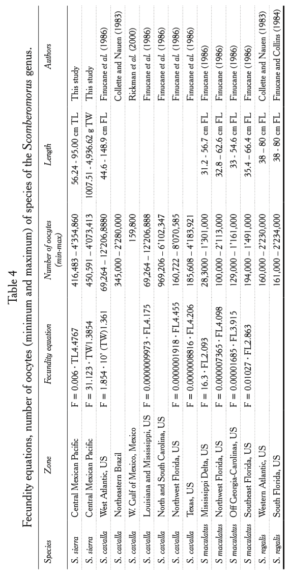 Table 4 shows fecundity values of other species of the genus Scomberomorus present in the Atlantic Ocean. S. regalis and S. maculatus show values of fecundity lower to those found in our study. S. regalis showed values of 160,000 to 2’230,000 oocytes in the Oriental Atlantic, according to Collette and Nauen (1983), and 161,000 to 2’234,000 oocytes South of Florida according to Finucane and Collins (1984).