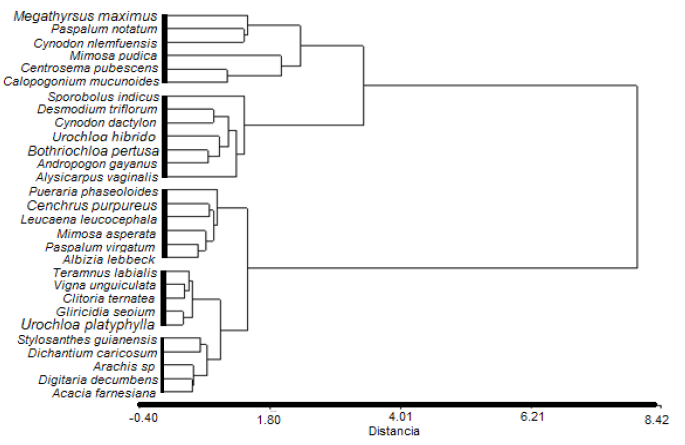 Mientras que el quinto grupo estuvo conformado por las especies, Teramnus labialis (L.f) Spreng, Vigna unguiculata (L.) Walp, Clitoria ternatea (L.), Gliricidia sepium (Jacq.) Kunth y Urochloa platyphylla (Munro ex C. Wright) R.D. Webster.