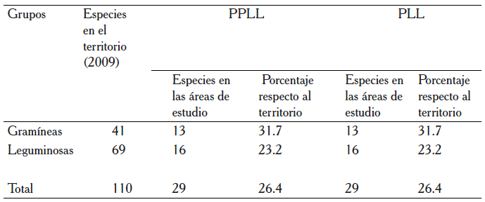 La investigación realizada demuestra que la información que posee el MINAG (2009), sobre la dinámica de las poblaciones de plantas en el territorio a través del tiempo, que informa 110 especies, de ellas, 69 leguminosas y 41 gramíneas, no es adecuada ya que se lograron identificar solamente 16 leguminosas y 13 gramíneas. Esta pérdida de la biodiversidad de especies pratenses constituye una alerta para el futuro, además de que la vegetación predominante son de especies naturales que tienen las características de tener alto grado de adaptabilidad al agroecosistema y no son consumidas por los animales (Ruiz et al., 2015).
