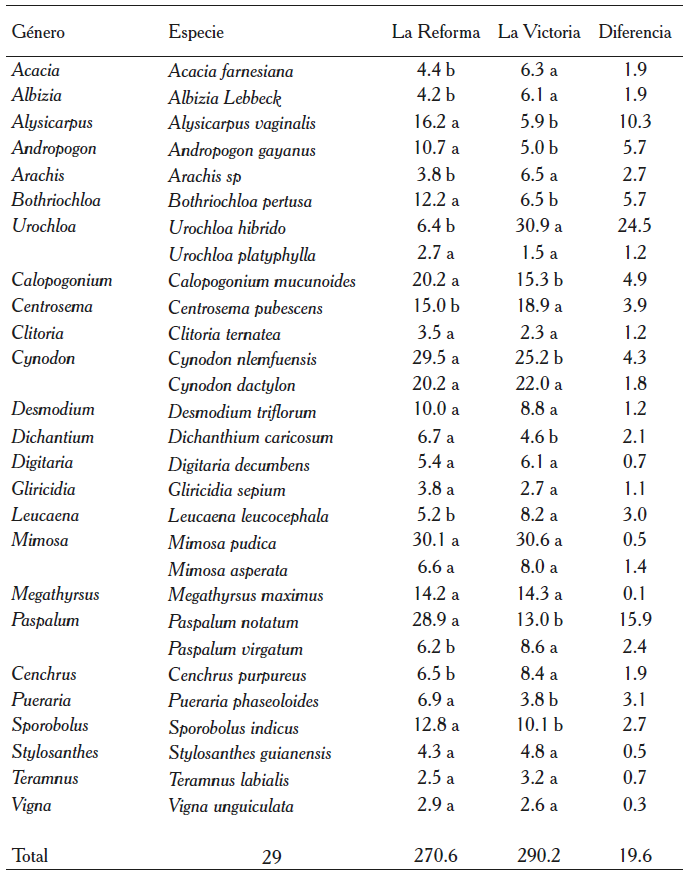 En este mismo sentido, Oquendo et al. (2013), en investigaciones llevadas a cabo en la provincia de Holguín, identificaron 26 especies de gramíneas y 24 de leguminosas en áreas ganaderas, lo que demuestra una mayor diversidad en esa región, en comparación con la Isla de la Juventud, lo que puede estar influenciado por factores tales como las condiciones edafoclimáticas de las zonas en estudio y por el manejo agropecuario de las áreas prospectadas.