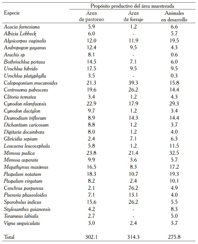 Para la presentación de los resultados se calculó una media entre las épocas del año por zonas ganaderas, la asociación entre las especies y con especies de otras familias y los usos del área (pastoreo de animales adultos, dedicada a la producción de forraje y animales en desarrollo).
