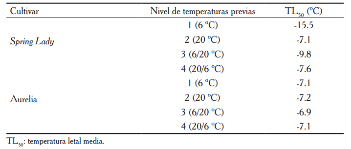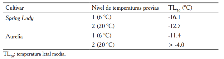 En ambos cultivares, la temperatura previa elevada aceleró la desaclimatación de las yemas florales, aumentando el daño a las temperaturas bajo cero estudiadas (figura 2). La temperatura previa de desaclimatación aumentó la TL50, es decir, la mitad de las yemas florales mostró daño a temperaturas negativas menos extremas (cuadro 1).