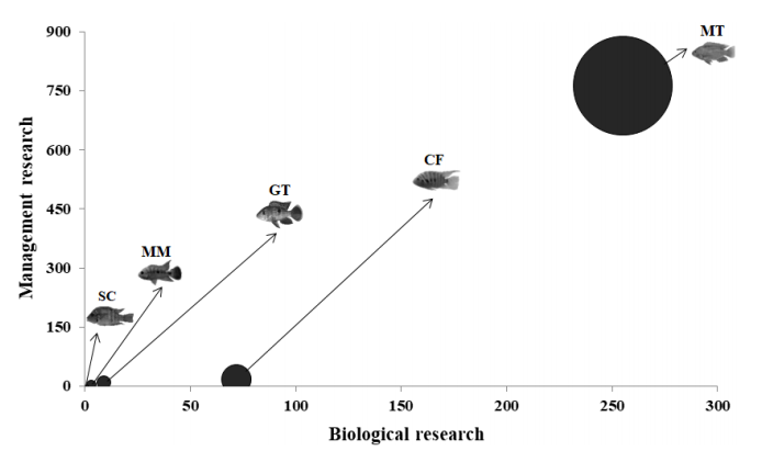 Mozambique tilapia presented 763 management and 255 biological researches. The convict fish had 18 management researches and 72 biological. The green terror had ten management and nine biological researches. Mexican mojarra actually presents five management and three biological researches, and the spotcheek cichlid only had a biological study (figure 1).