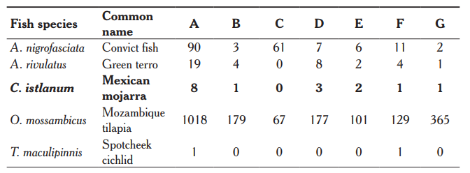 The most abundant non-native cichlid in the Amacuzac River is the convict fish, Amatitlania nigrofasciata (Günther, 1867), with an abundance of 52.42 % followed by the Mozambique tilapia with 16.25 %, spotcheek cichlid, Thorichthys maculipinnis (Meek, 1904) with 12.45 % and the green terror, Andinoacara rivulatus (Günther, 1860) with 9.90 %, meanwhile the Mexican mojarra represents just 8.9 7 % of the cichlids (Rosales, 2016). In Mexico the convict fish, the spotcheek cichlid, and the green terror are used as ornamental fish, and the Mozambique tilapia is used for meat production (Mejía-Mojica et al., 2012). Mexican mojarra is used as food resource and its maintenance and reproduction in captivity has been investigated (Luna-Figueroa and Figueroa, 2000).