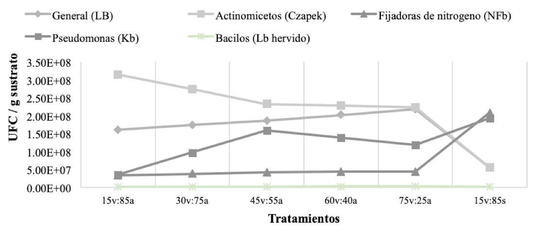 Con base en los medios de cultivo utilizados (Lb para bacterias en general, Kb para Pseudomonas, Czapek para actinomicetos, NFb para fijadoras de nitrógeno) se presentaron diferencias estadísticas significativas (P≤ 0.05) entre los tratamientos; donde el medio Czapek para desarrollo de Actinomicetos, obtuvo la mayor respuesta con 20 x 107 UFC g-1 de sustrato; mientras que el medio Lb hervido para el desarrollo de Bacilos, tuvo la menor con 1 x 106 UFC g-1 de sustrato (figura 2).