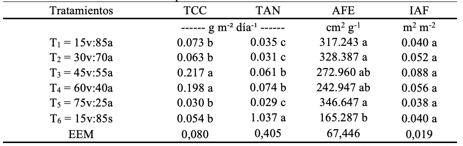 Donde, a= arena; v= vermicompost; s= suelo; TCC= Tasa de crecimiento del Cultivo; TAN= Tasa de Asimilación Neta; AFE= Área Foliar Especifica; IAF= Índice de Área Foliar. Letras distintas dentro de cada columna indican diferencia estadística significativa (Tukey P≤ 0.05).